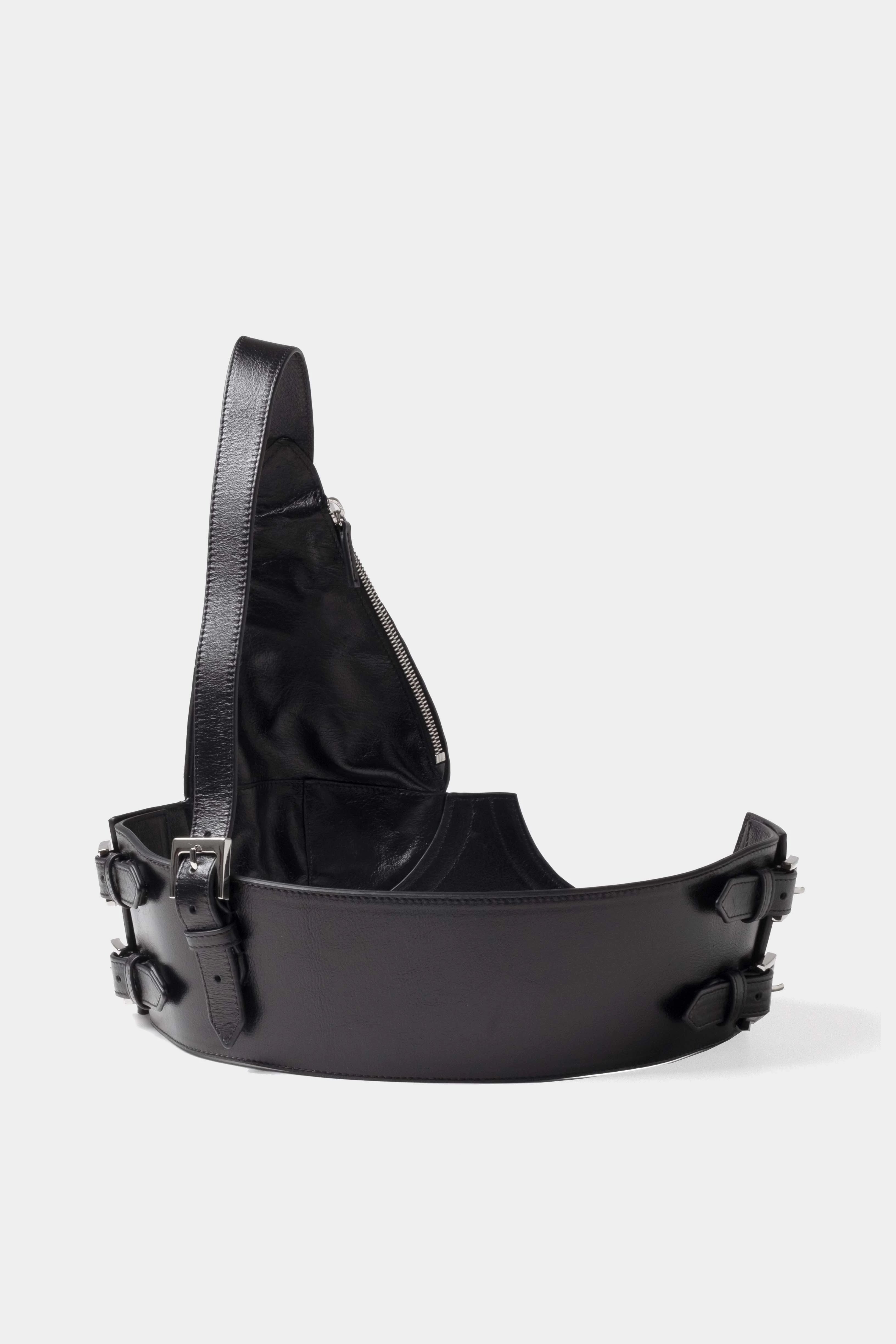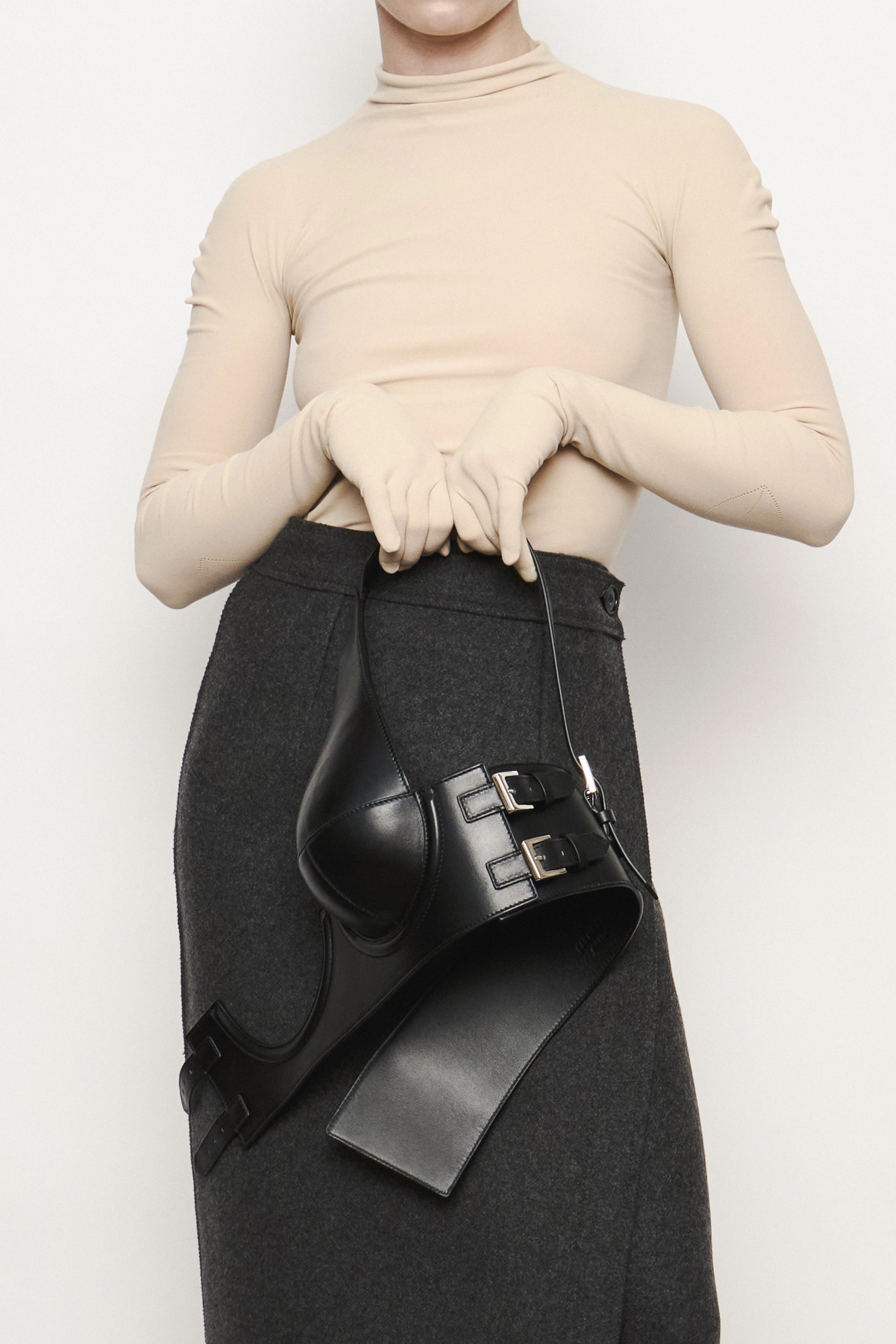 Soft leather corset with a molded breast and an integrated pocket. Designed to fit close to the body, balancing structure and flexibility. Fastens at the back with an adjustable shoulder strap. Crafted from smooth, high-quality leather.