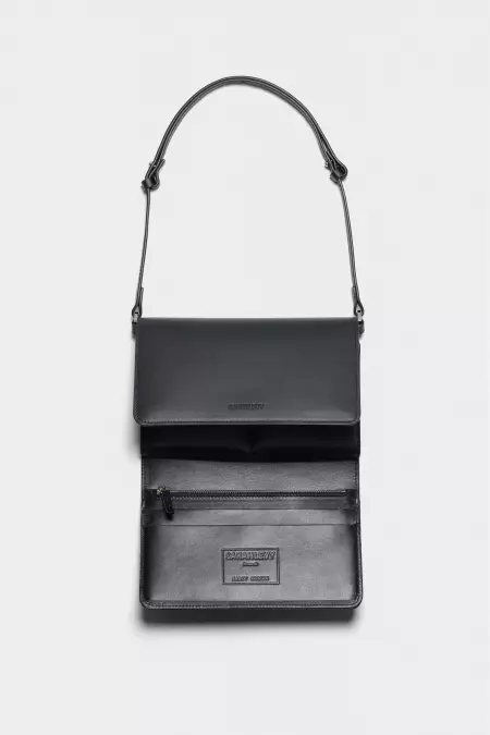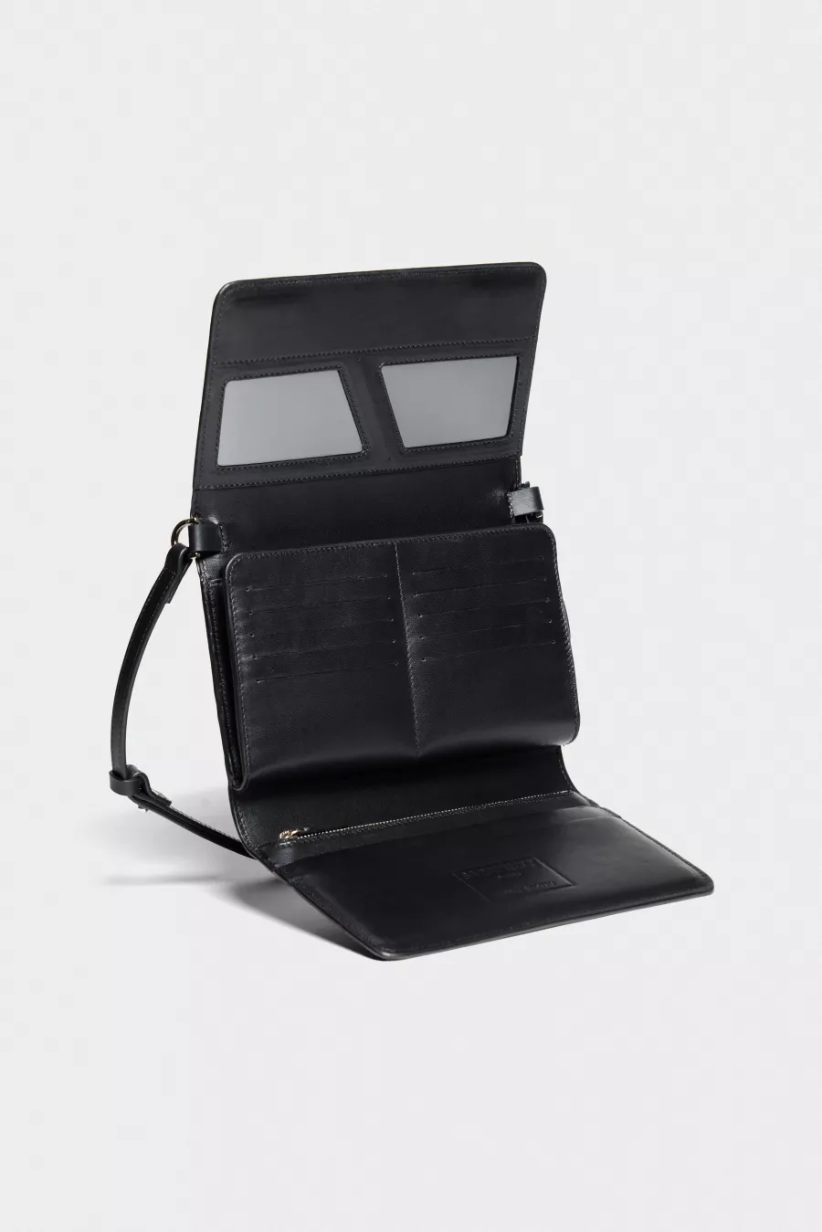 Minimalist leather pouch that unfolds in three sections, featuring a spacious main zipped pocket, card slots, a flat zipped compartment, and photo holders. Designed for organized storage and practical use, with a clean, minimal silhouette.