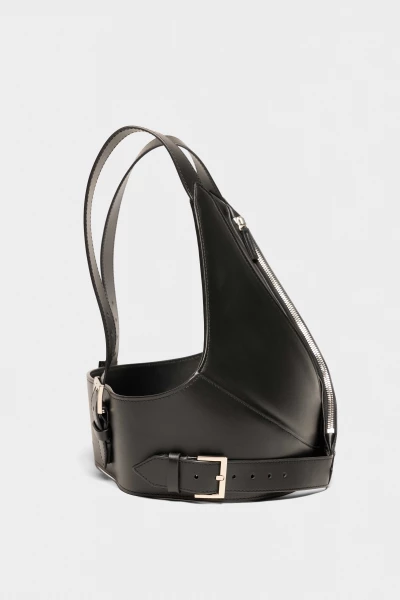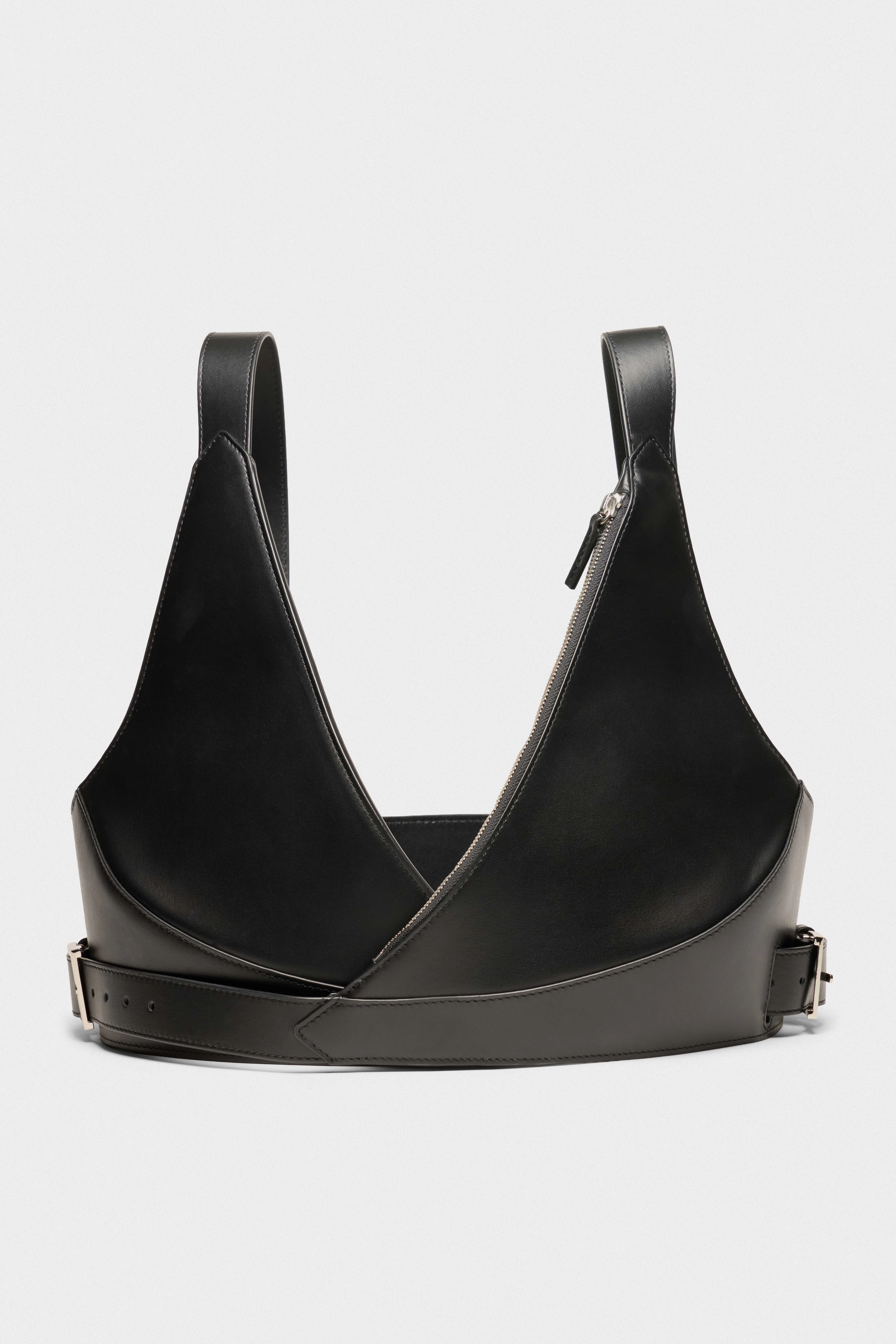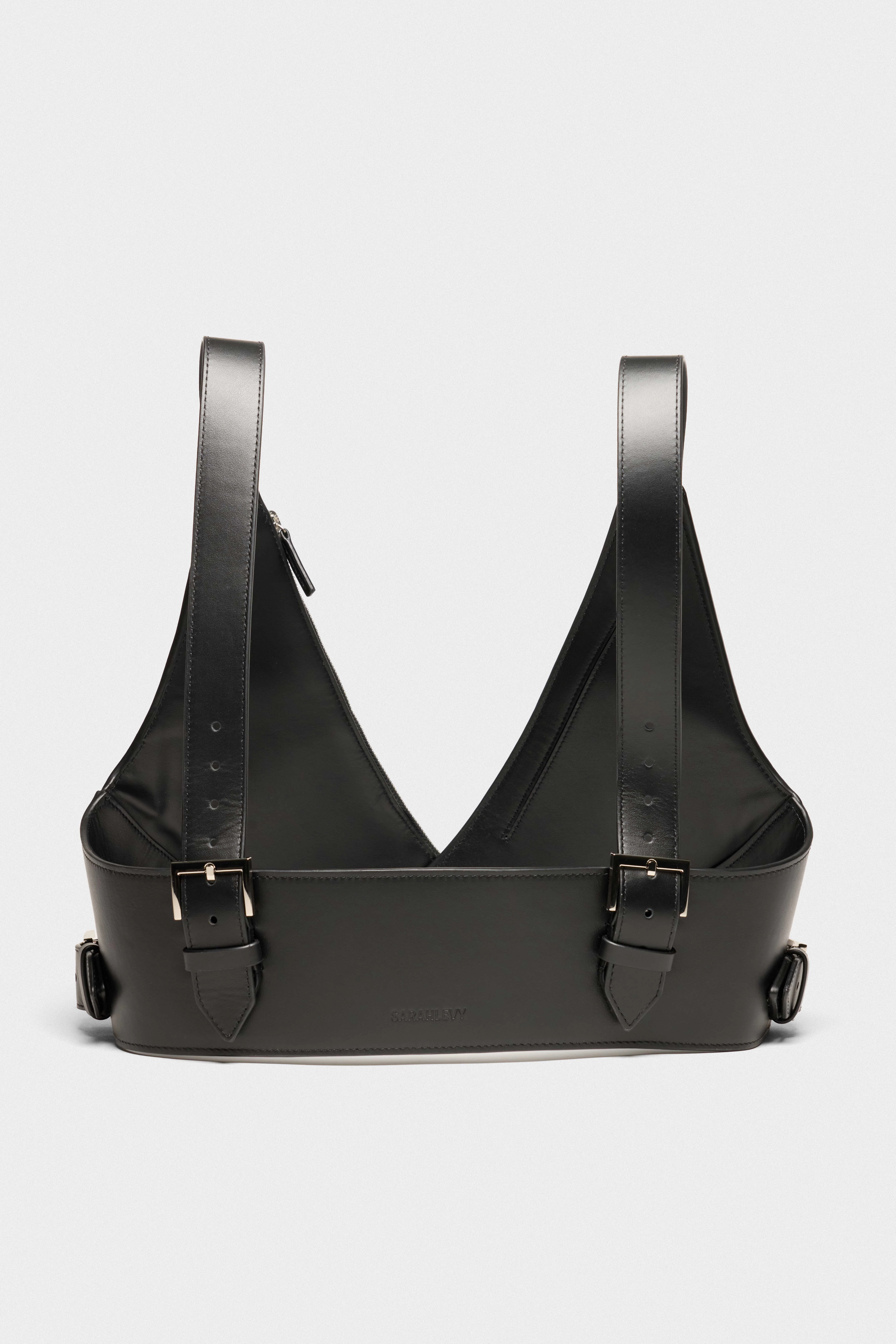 Soft leather corset with a large pocket on the left and a flat interior pocket on the right. Designed to wrap around the chest for a close, adjustable fit, with adjustable shoulder straps and chest size. Crafted from smooth, high-quality leather.