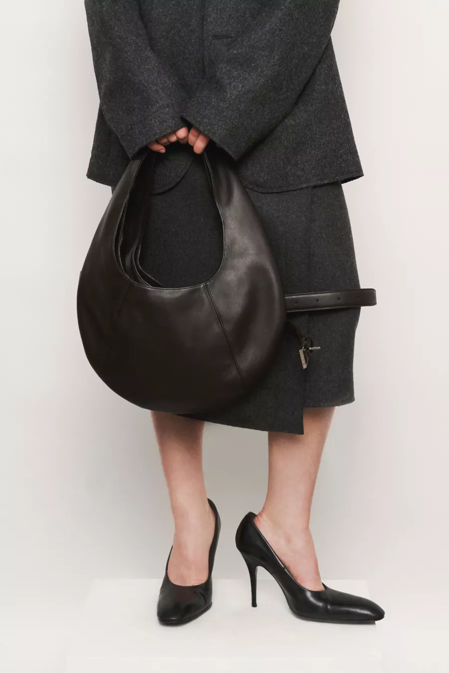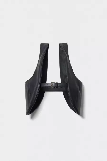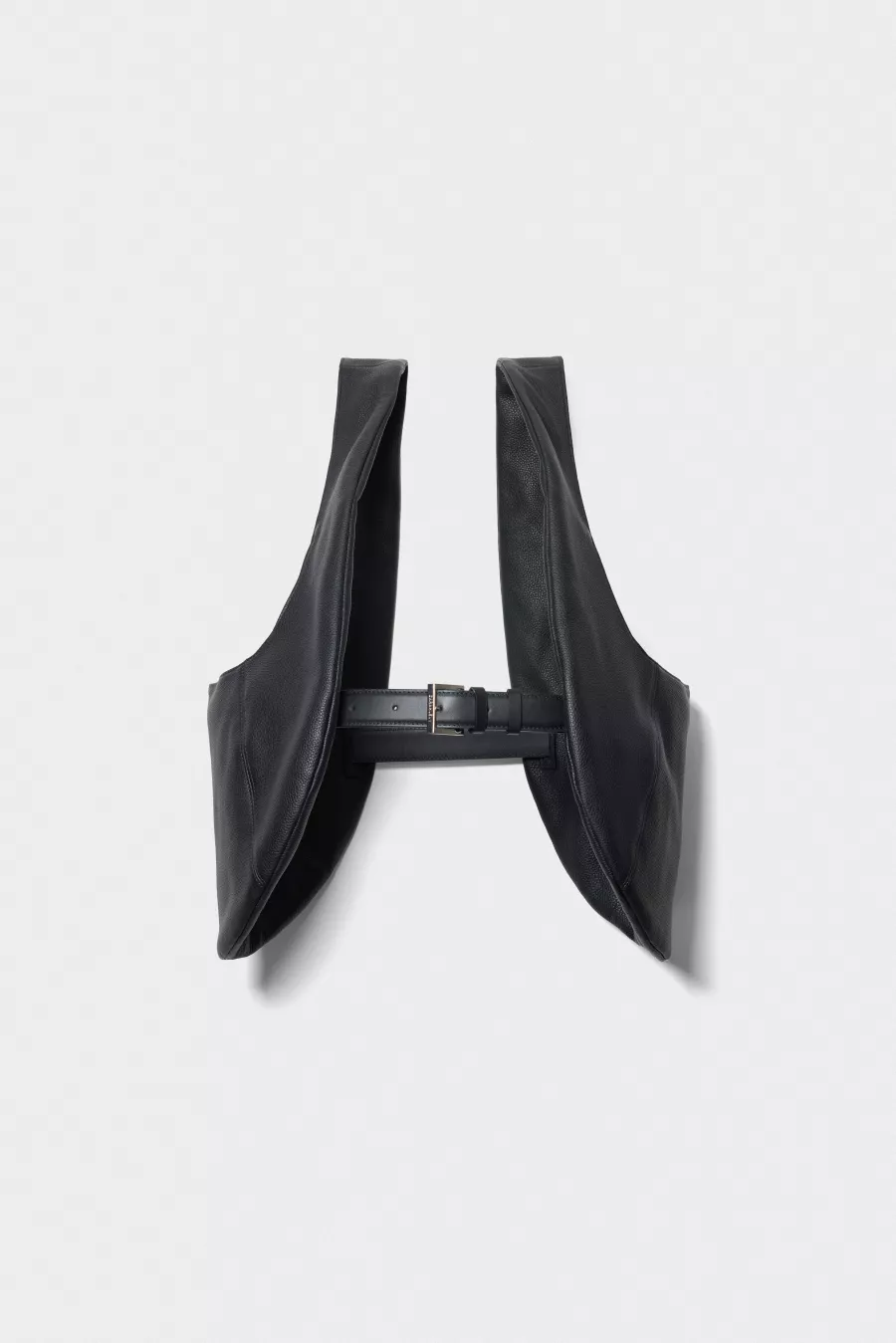 Two elliptical-shaped bags, each with a large magnet-secured pocket and a flat interior pocket, connected by a belt to be worn as a vest or over the shoulder. Designed for flexible wear and practical storage, with a clean, minimal silhouette.