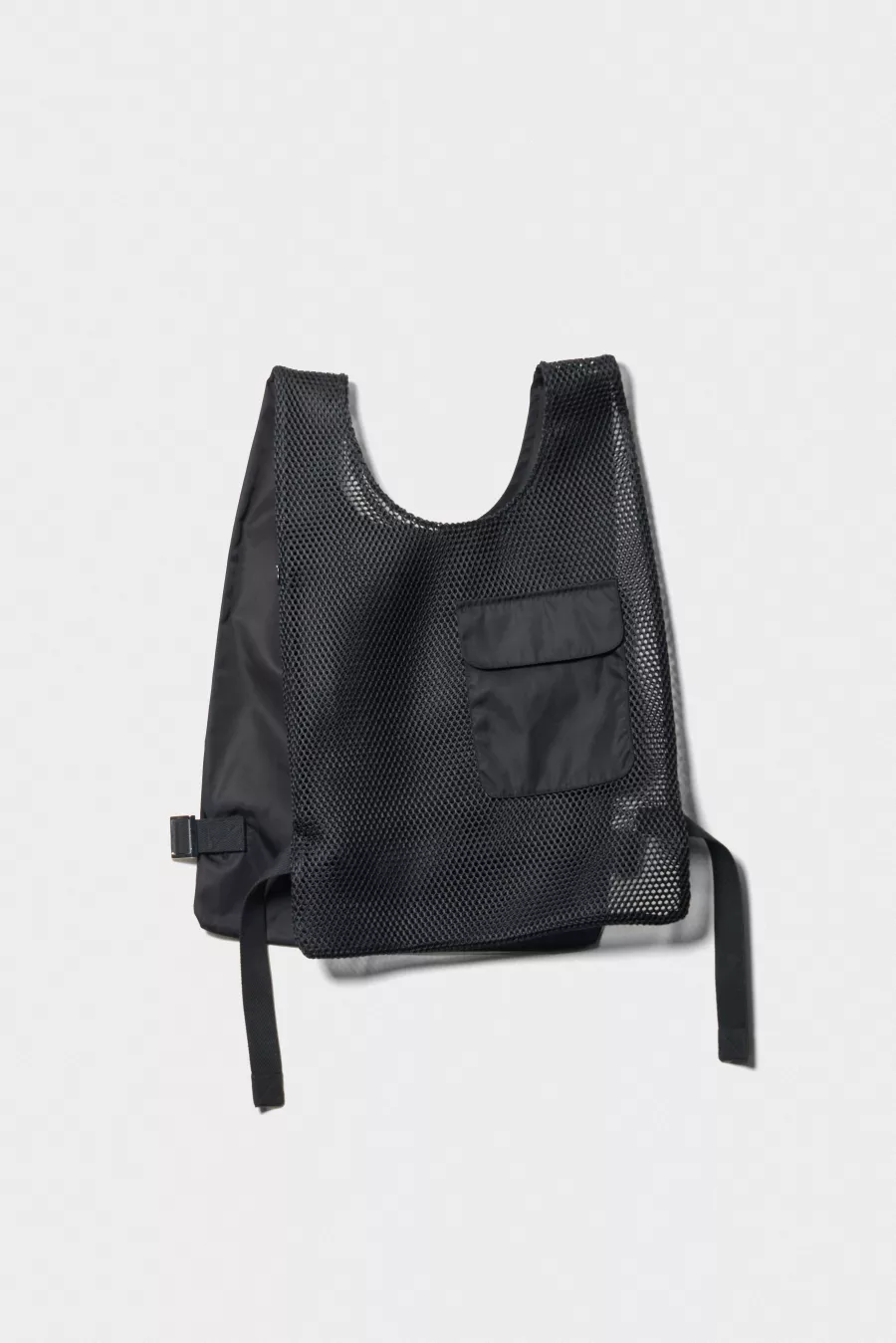 Two tote bags connected at the handles to be worn as a vest, featuring a front pocket, a side zipper providing access to a large front compartment, and adjustable waist straps. Can also be carried by hand, offering two spacious compartments. Designed for flexible wear and practical storage, with a minimal silhouette.