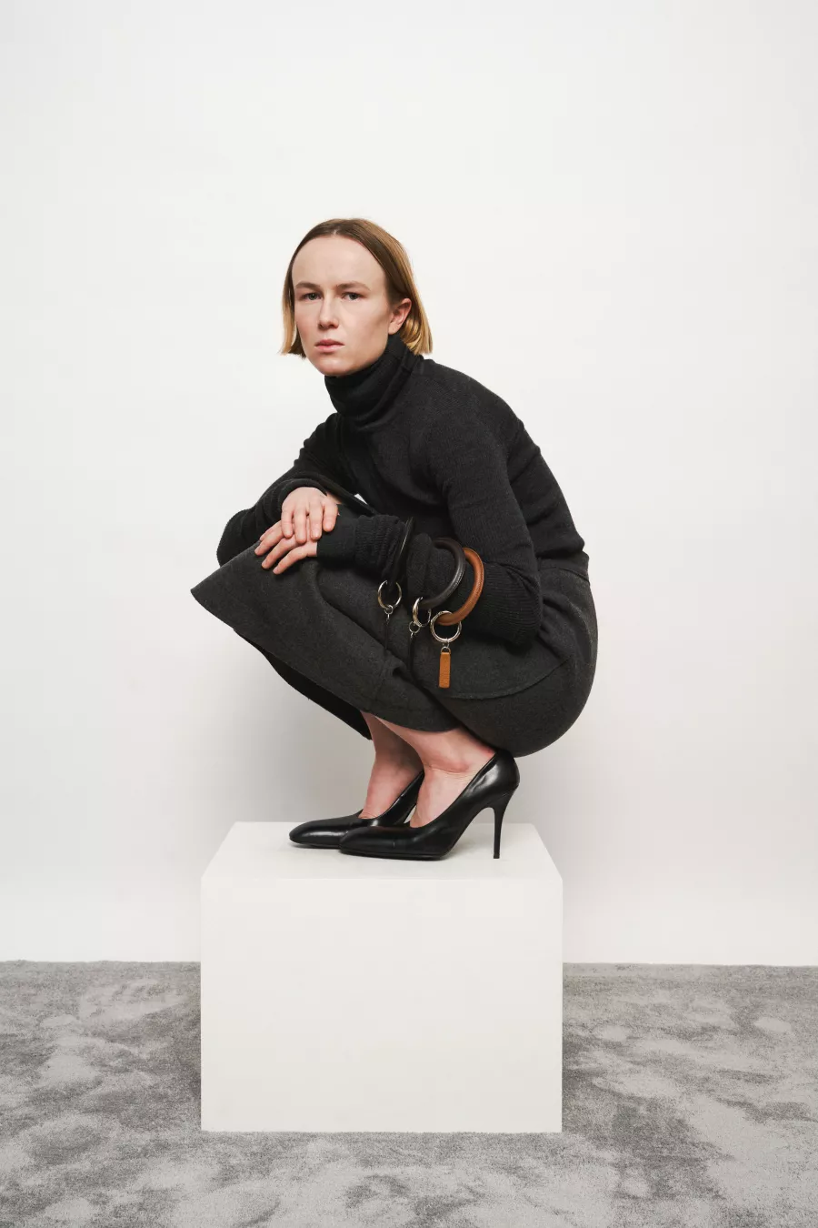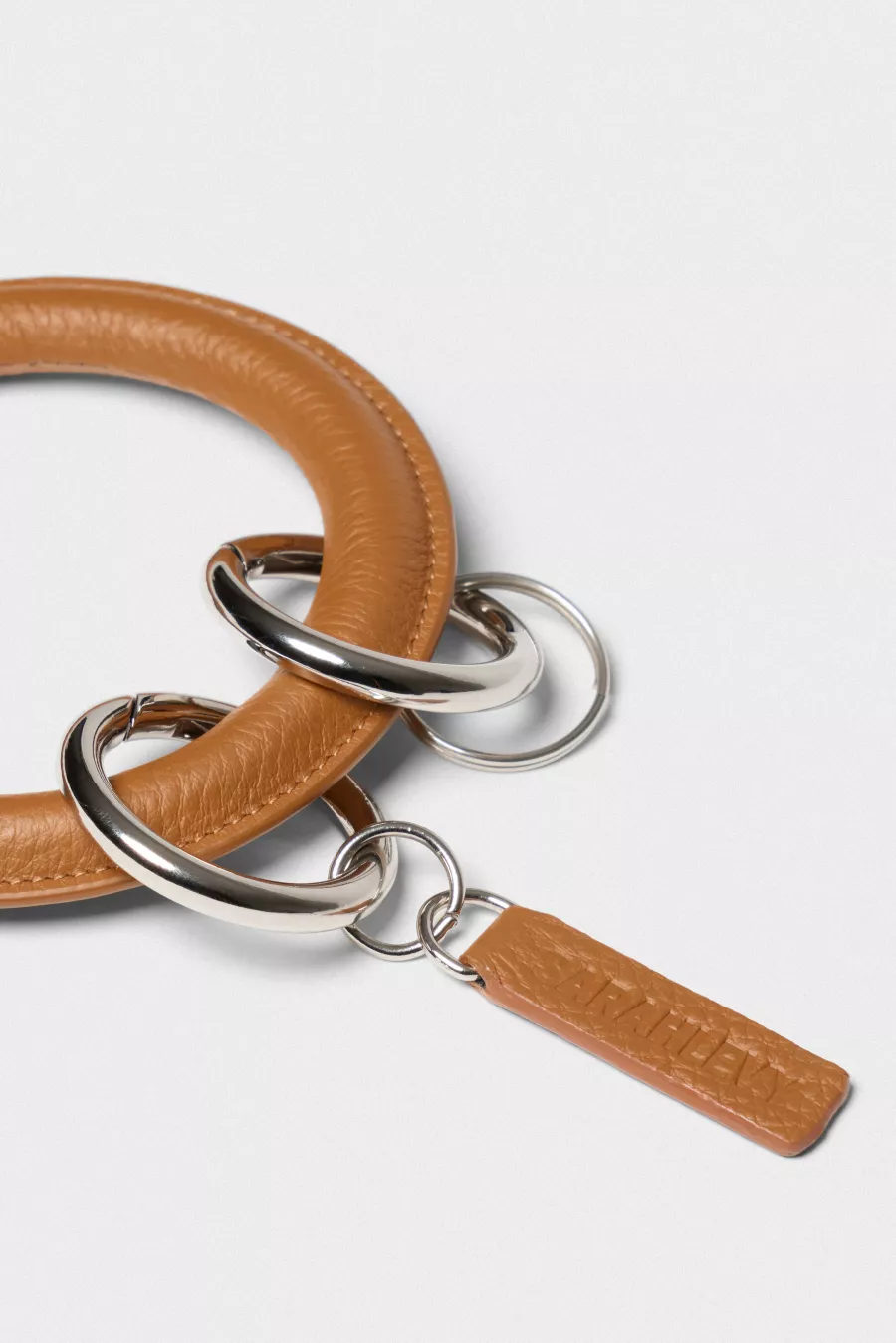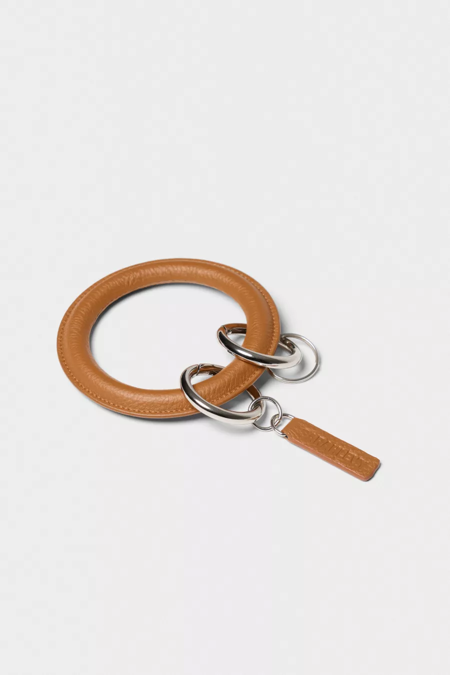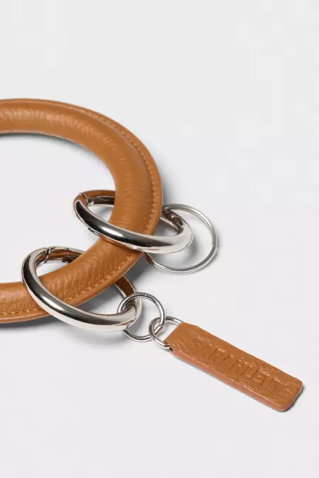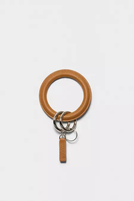 Leather bracelet key ring with two metallic split rings. Designed to be worn around the wrist, offering a practical way to keep keys close at hand. Crafted from smooth leather with a rounded, minimal silhouette.
