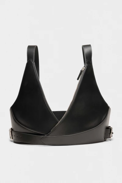 Soft leather corset with a large pocket on the left and a flat interior pocket on the right. Designed to wrap around the chest for a close, adjustable fit, with adjustable shoulder straps and chest size. Crafted from smooth, high-quality leather.