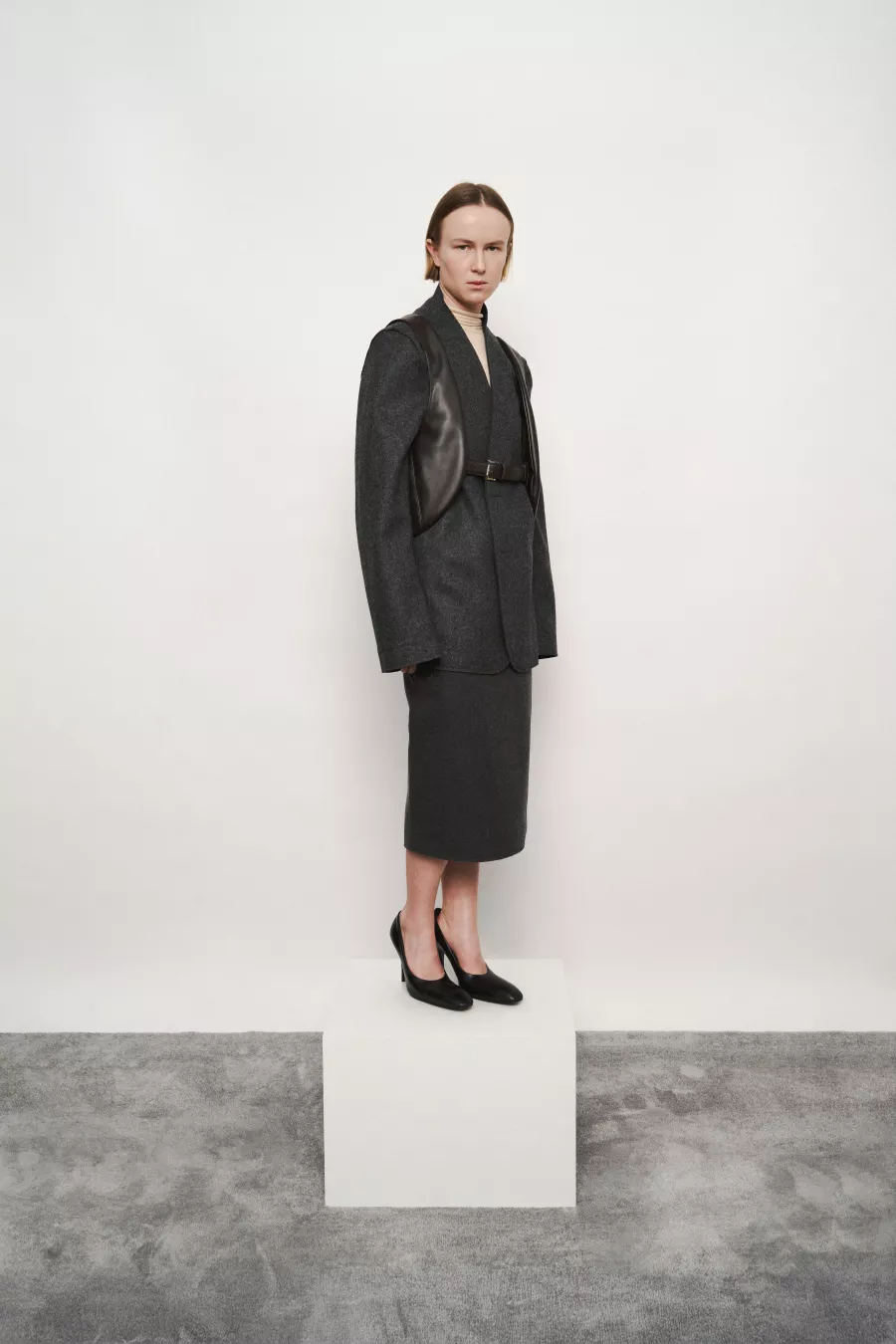 Two elliptical-shaped bags, each with a large magnet-secured pocket and a flat interior pocket, connected by a belt to be worn as a vest or over the shoulder. Designed for flexible wear and practical storage, with a clean, minimal silhouette.