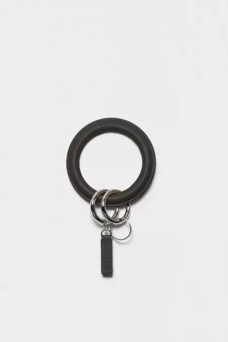 Leather bracelet key ring with two metallic split rings. Designed to be worn around the wrist, offering a practical way to keep keys close at hand. Crafted from smooth leather with a rounded, minimal silhouette.