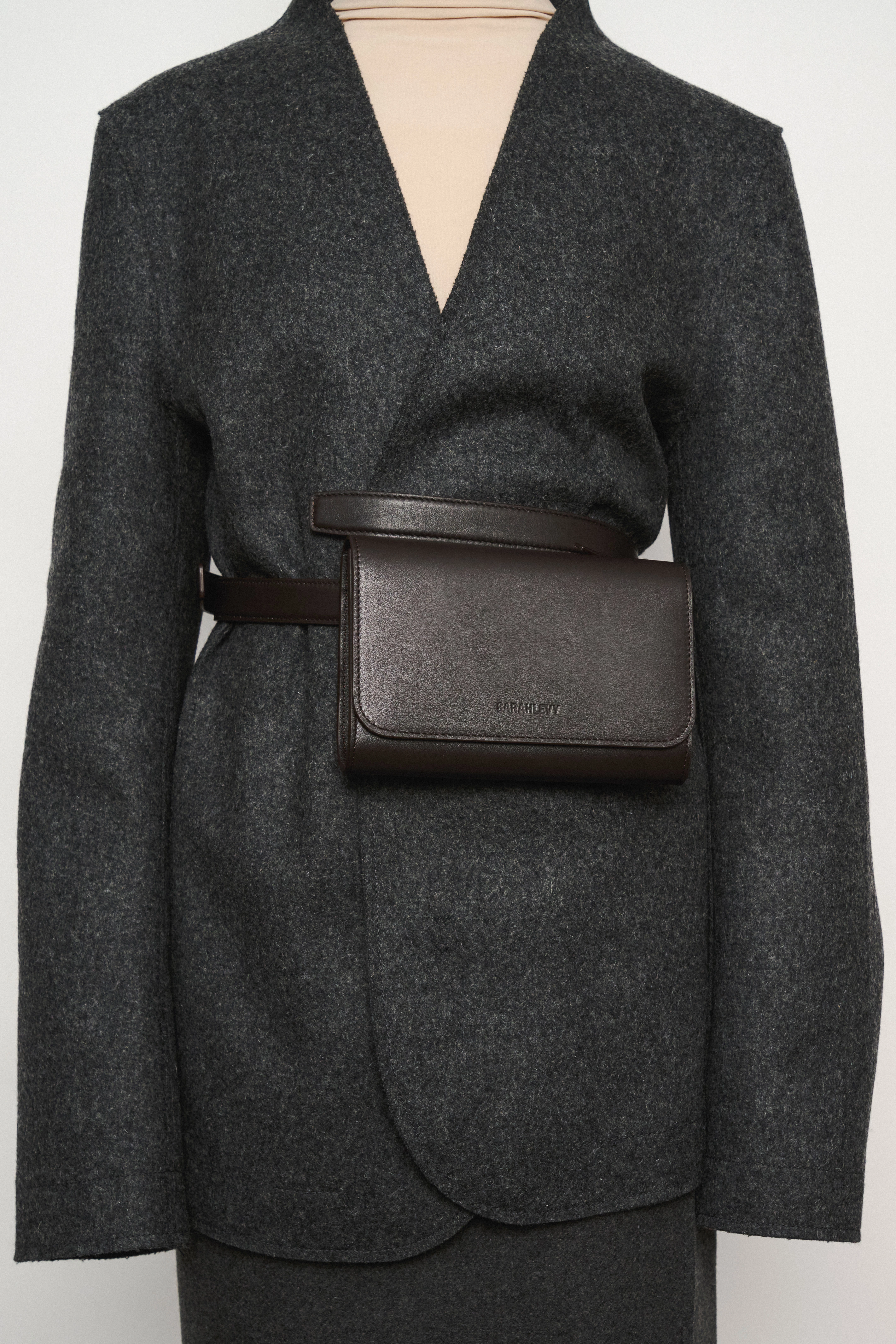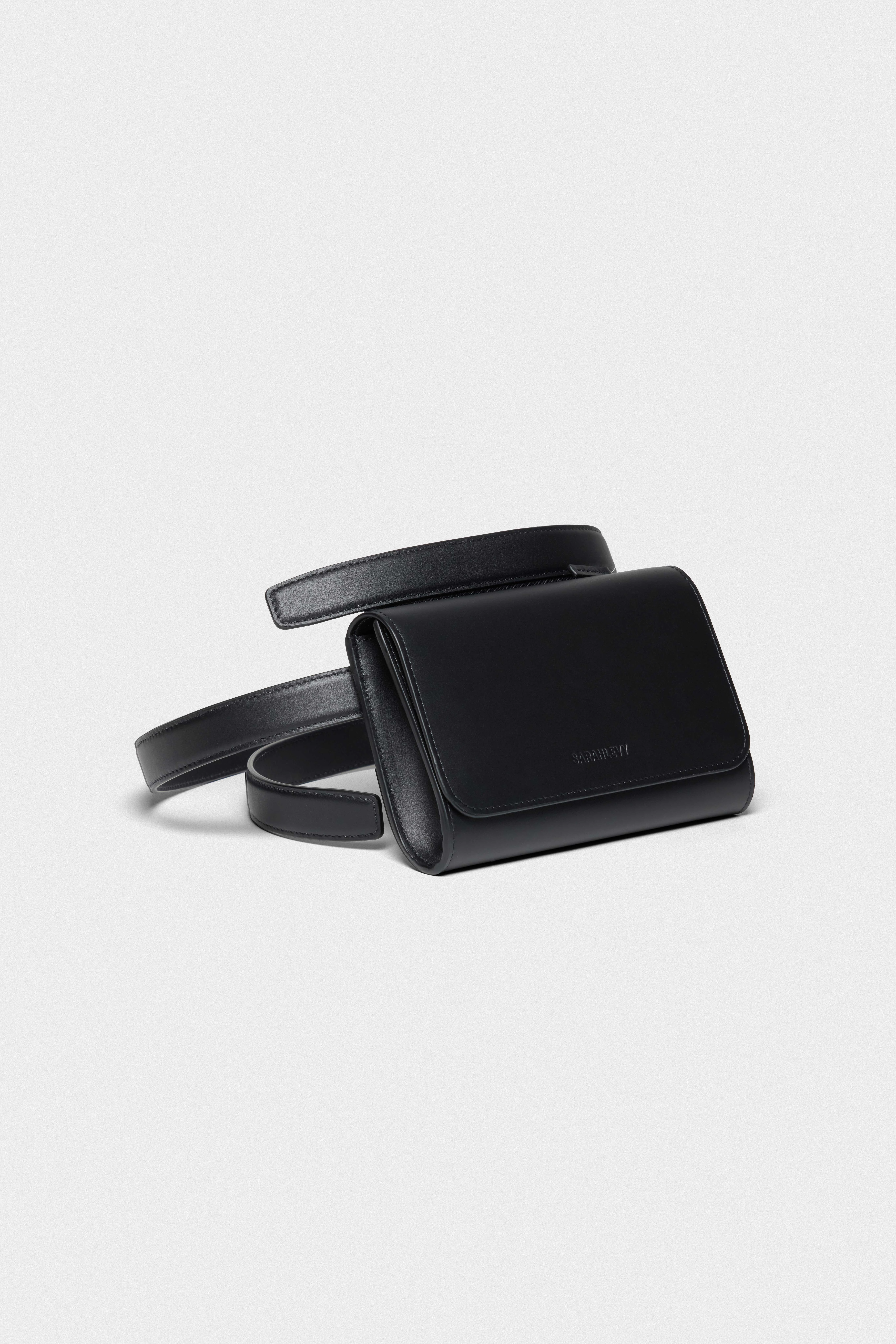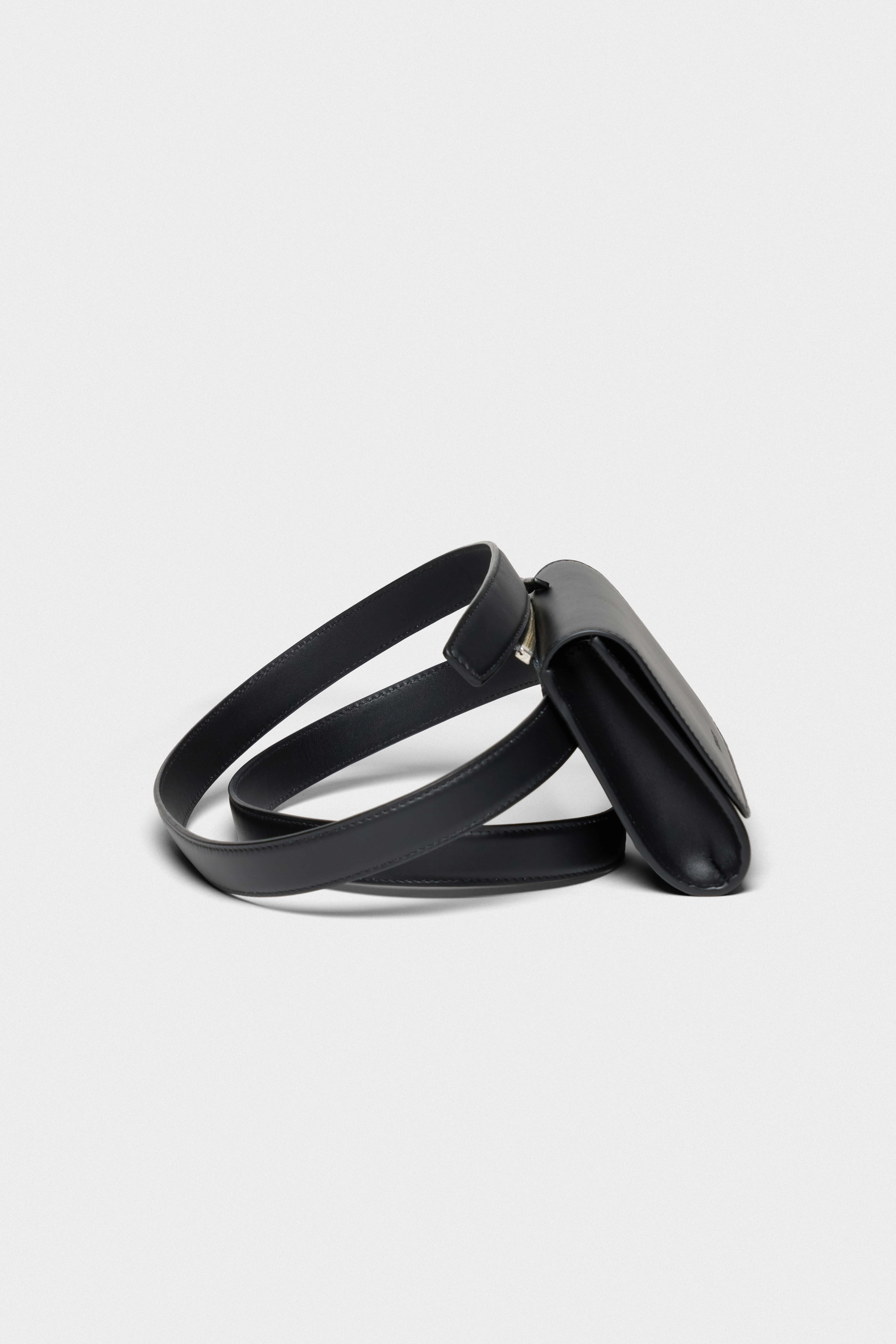 Leather pouch zipped to a belt that slides through a back coulisse, allowing it to be worn crossbody or adjusted around the waist. Designed for versatile styling and practical use, with a clean, minimal silhouette. Crafted from smooth, high-quality leather.